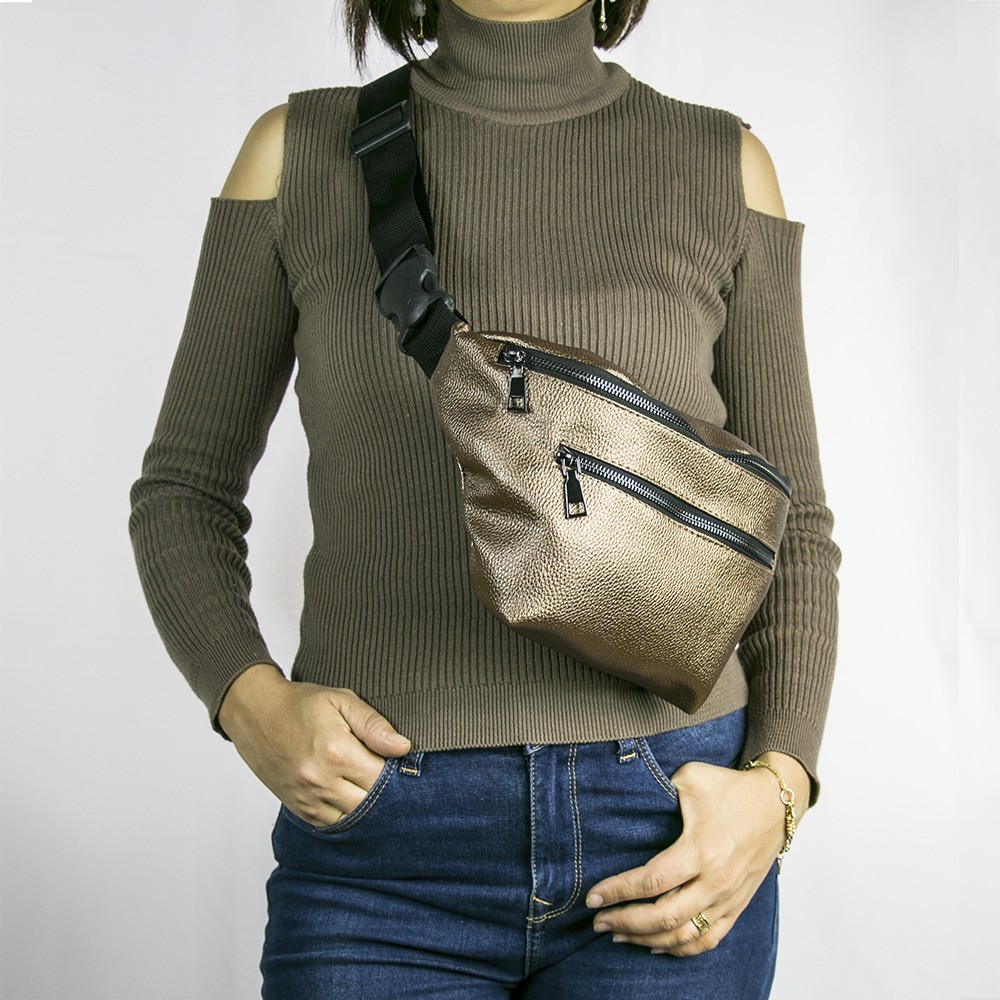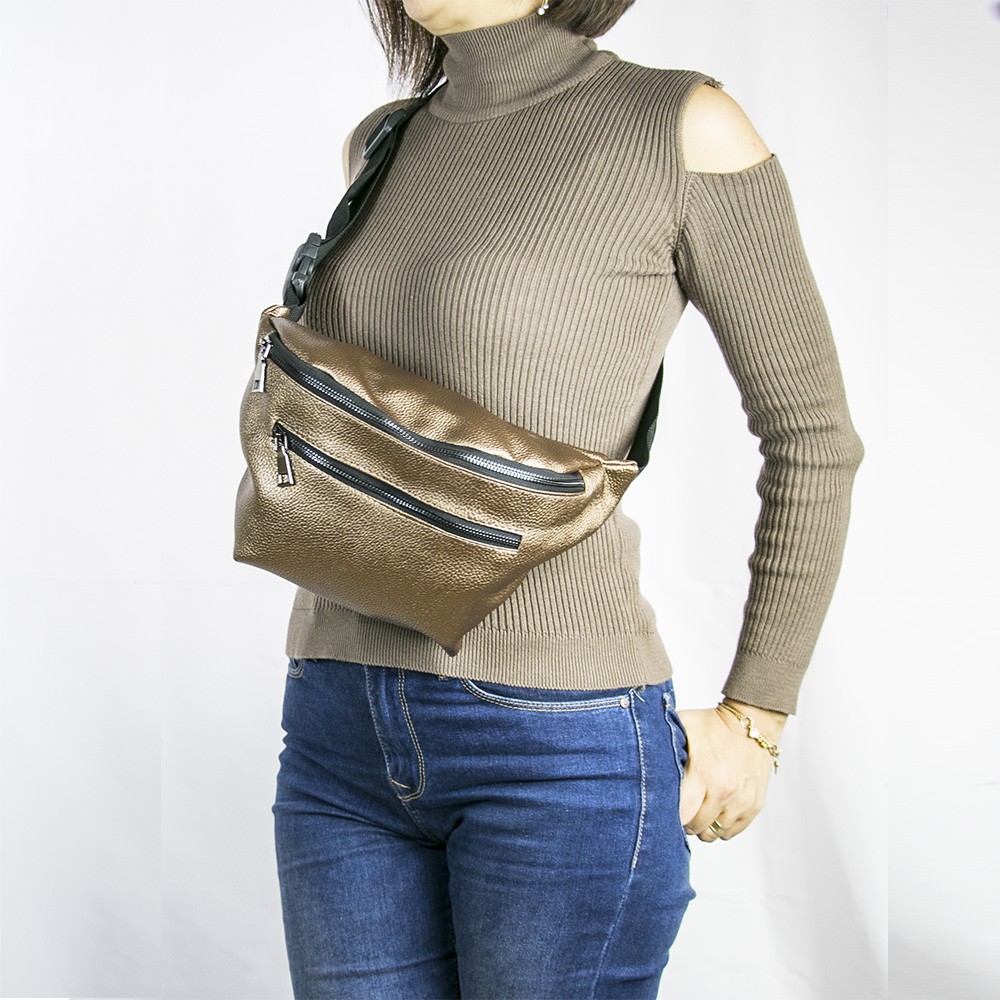 Kadın Parlak Kahverengi Çift Fermuarlı Kemerli Büyük Bel Çantası